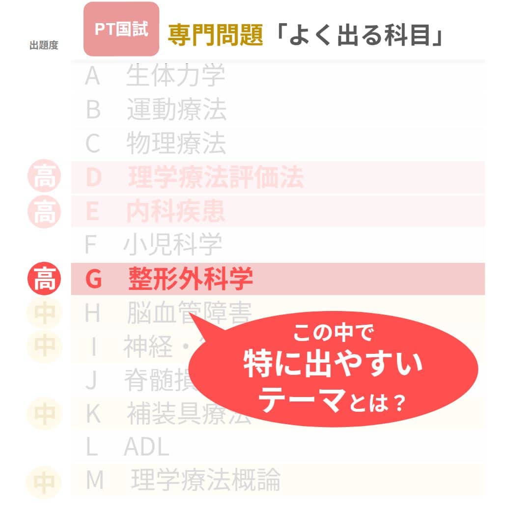 PT国試のPT専門問題では「D 理学療法評価法」「E 内科疾患」「G 整形外科学」が3大頻出ジャンルです。
