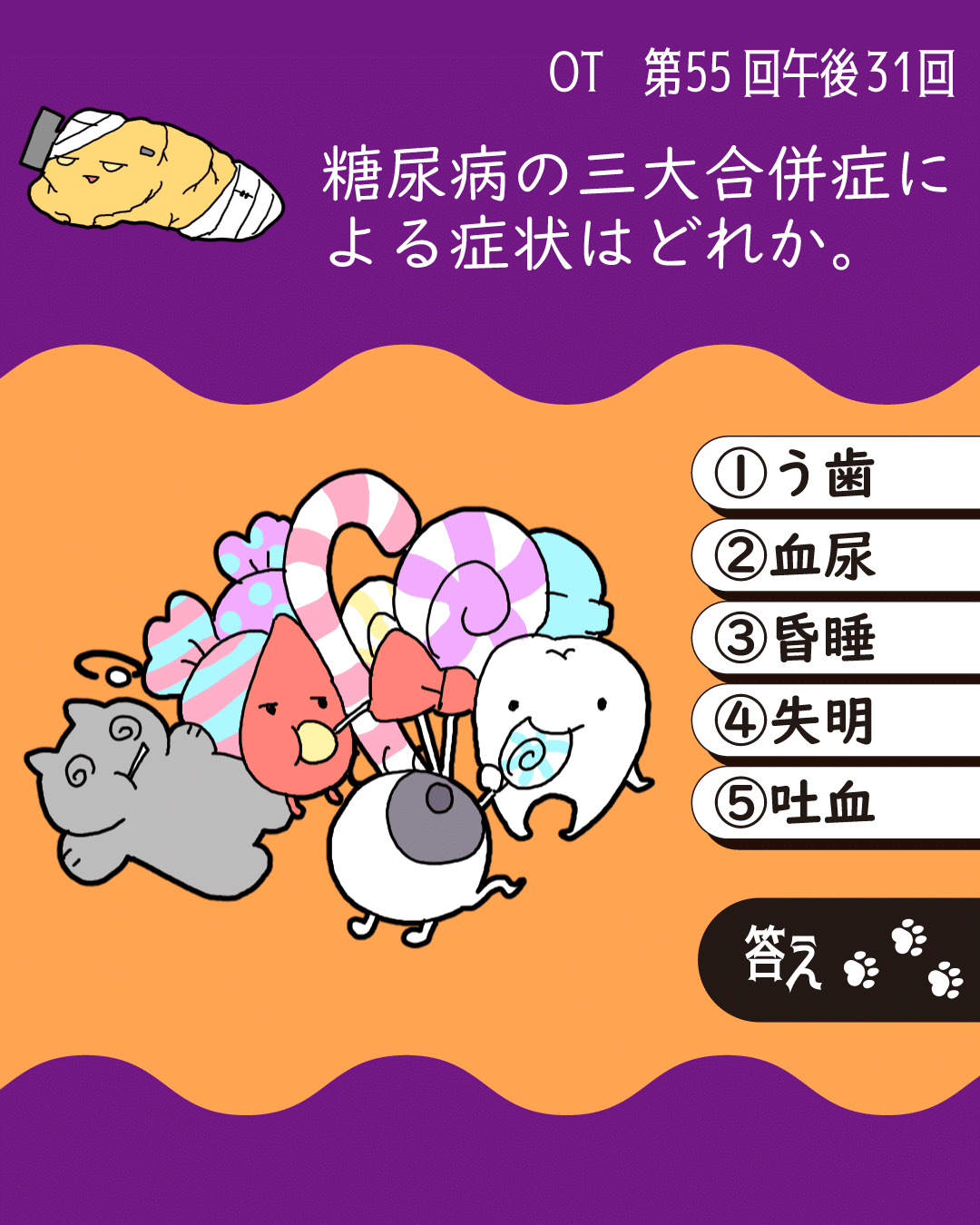 糖尿病の三大合併症は①神経症状➁網膜症③腎症である。選択肢①のう歯(むし歯)は三大合併症による症状ではないので注意しましょう。